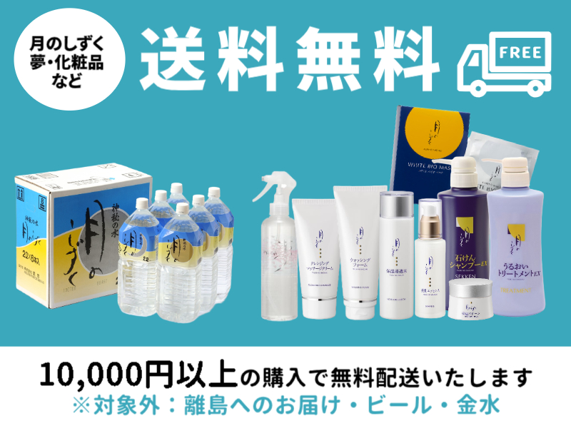 「金水」「銀水」の2つのお水をブレンドした 「月のしずく」に代表されるミネラルウォーターから、 化粧品、食品に至るまで多岐にわたります。 それらの商品は、成分や機能より、 お水が持つ力が素直に受け手の方に届くように開発しています。