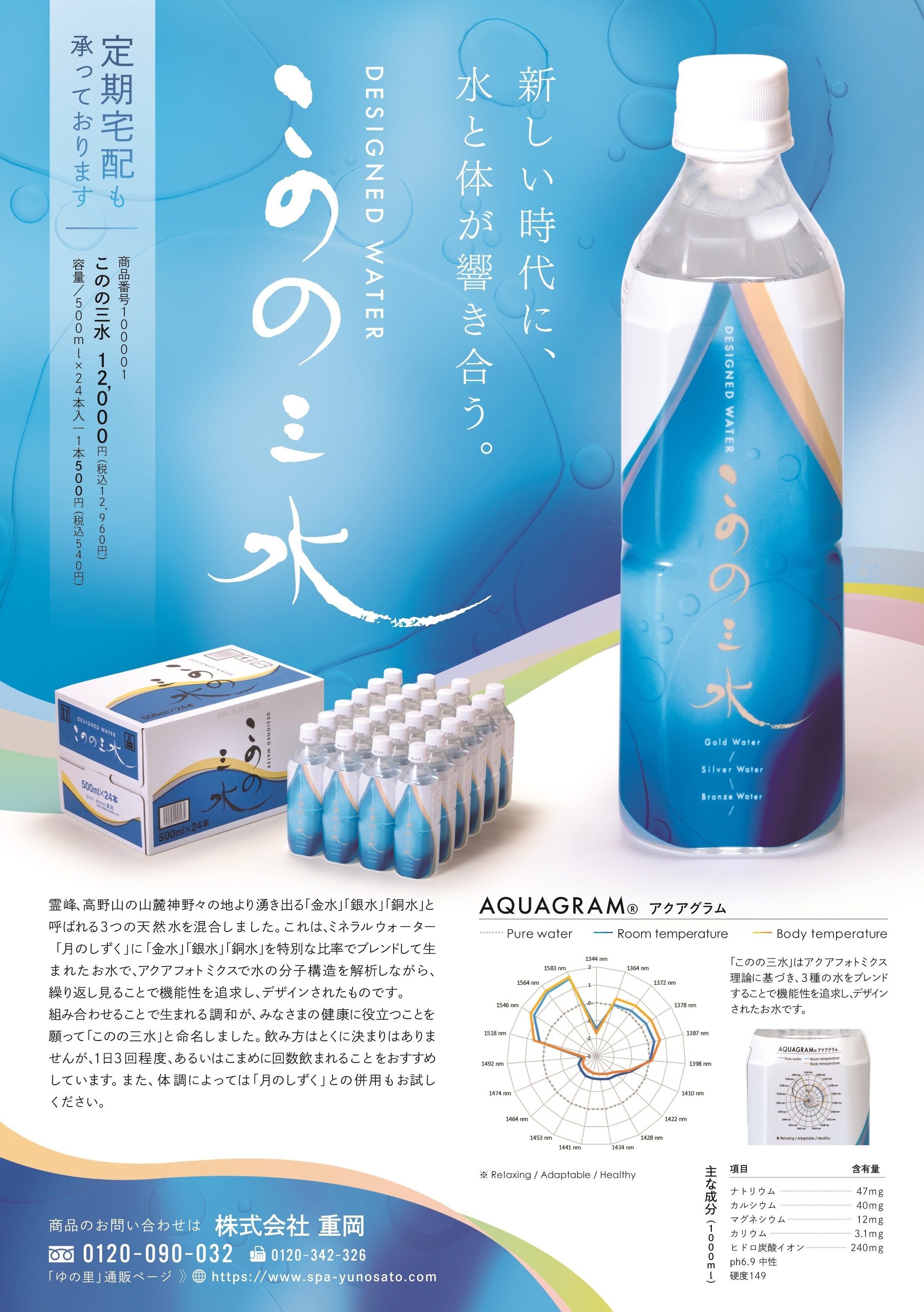 霊峰、高野山の山麓神野々の地より湧き出る「金水」「銀水」「銅水」と呼ばれる3つの天然水を混合しました。これは、ミネラルウォーター「月のしずく」に「金水」「銀水」「銅水」を特別な比率でブレンドして生まれたお水で、アクアフォトミクスで水の分子構造を解析しながら、繰り返し見ることで機能性を追求し、デザインされたものです。